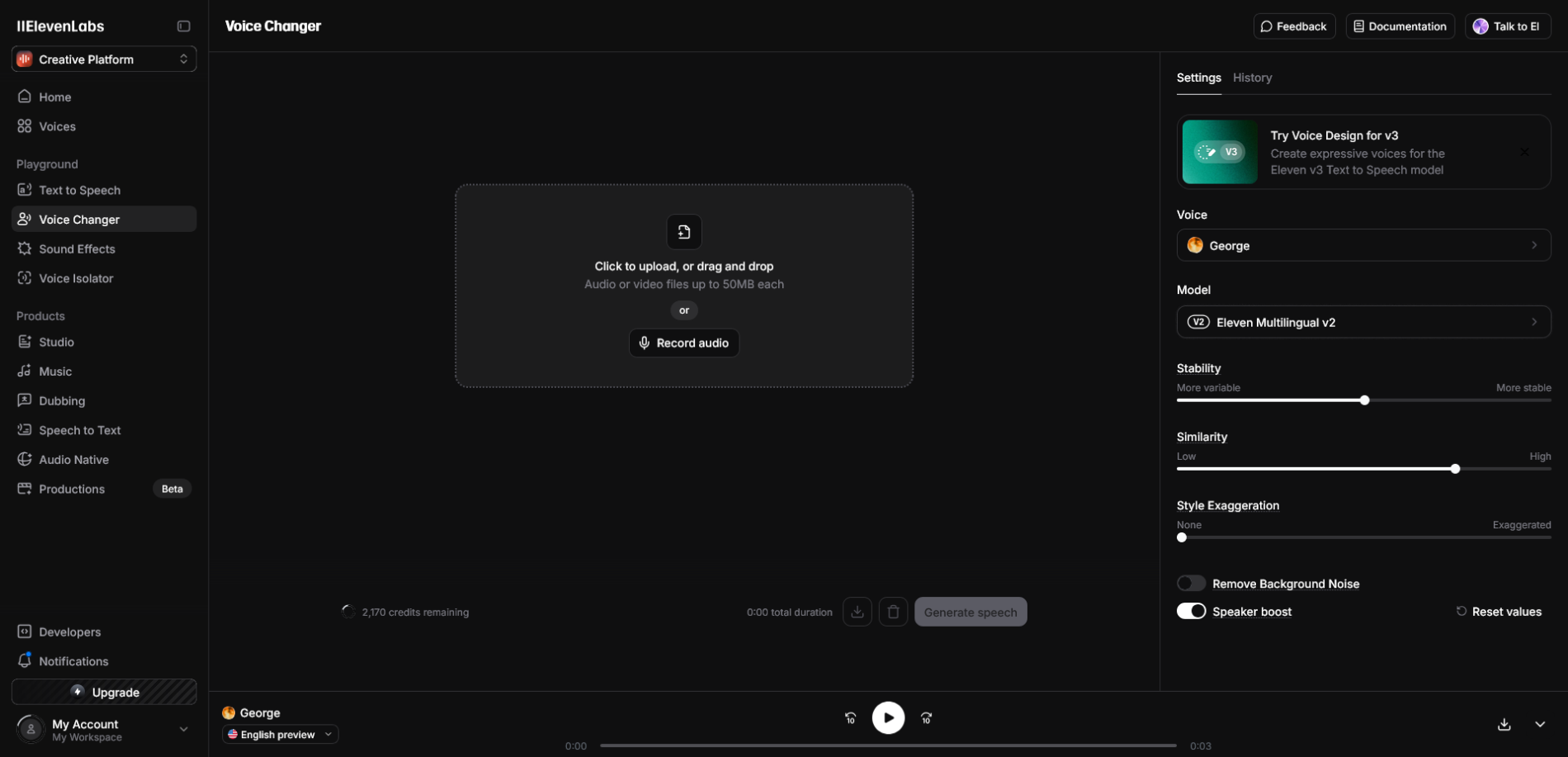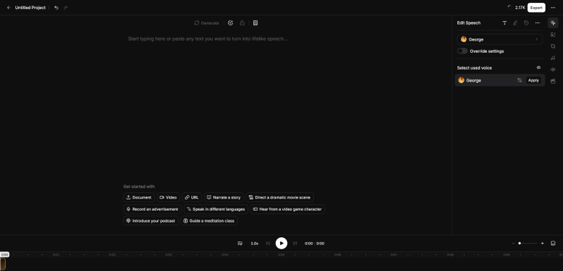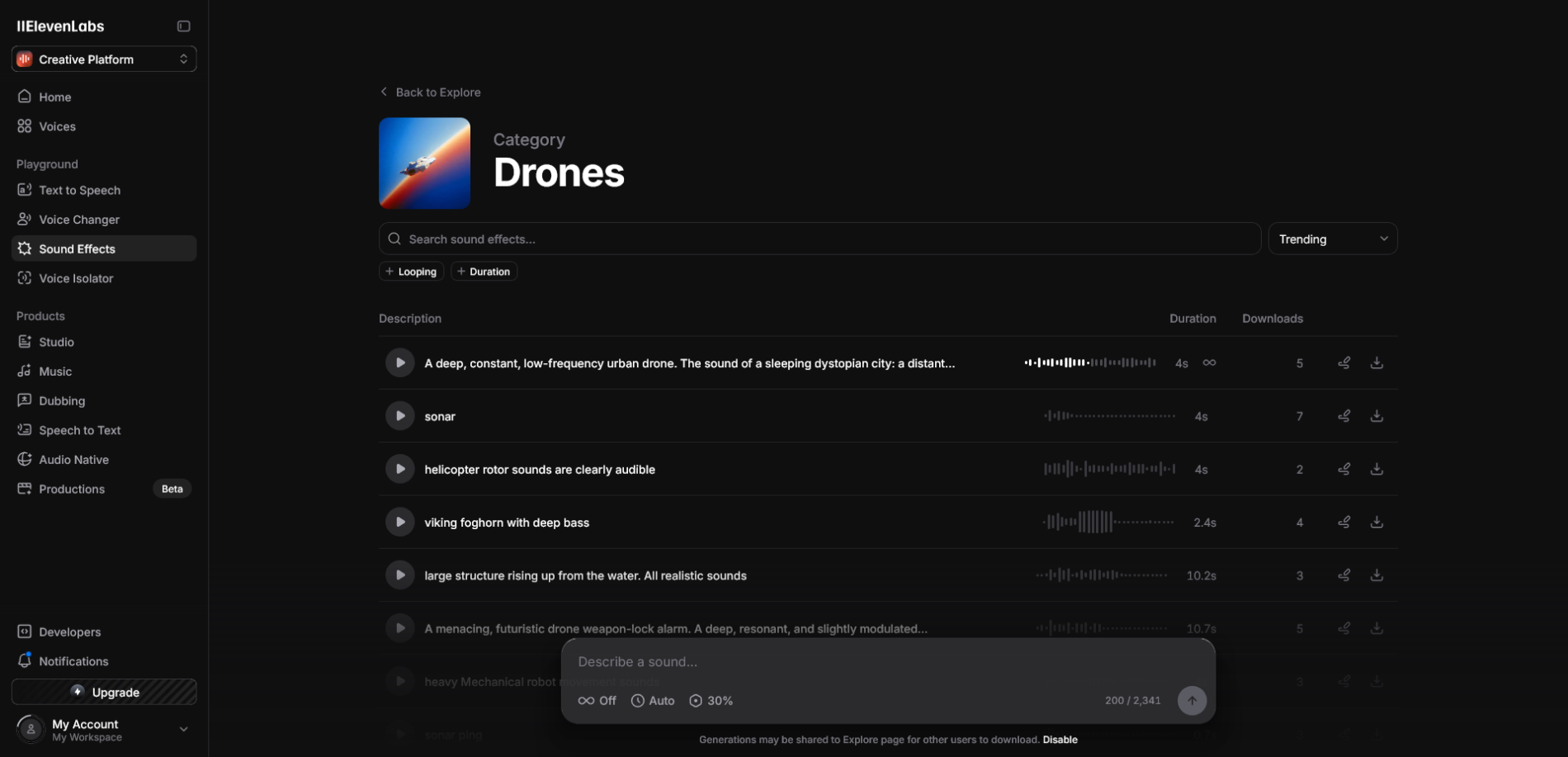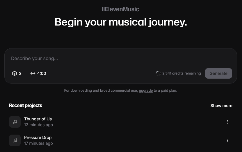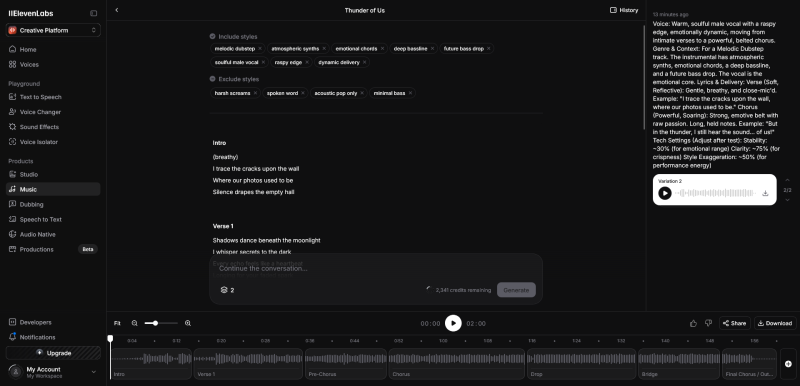ElevenLabs ist eine KI-basierte Plattform für KI-Stimmen und Audioinhalte. Die Funktionen umfassen Text-to-Speech, Stimmenisolation und die Erstellung von Stimmmodellen. Die Stimmmodelle können auf Referenzaufnahmen oder Parametern basieren. Man kann auch komplette Songs in unterschiedlicher Länge und mit Stille erstellen. Nach der Erstellung kann man die Songs anhand ihrer Struktur (Intro, Verse, Chorus etc.) noch weiter anpassen und in der Reihenfolge verändern. ElevenLabs hat auch eine Sammlung von Soundeffekten und die Möglichkeit, neue zu erstellen.ElevenLabs wurde auf Basis lizenzierter Inhalte trainiert. Zudem bestehen Partnerschaften mit u. a. BMG, Kobalt und Merlin.