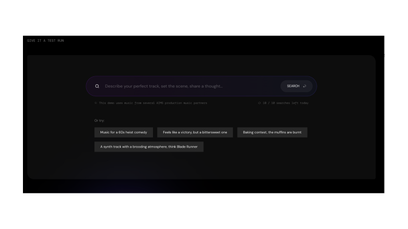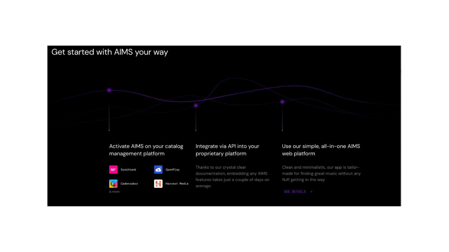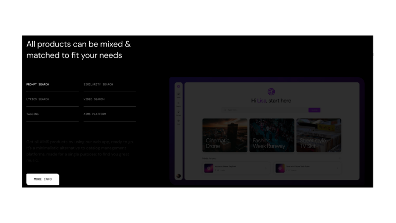 AIMS bietet eine KI-gestützte Plattform für Musik-Suche, -Entdeckung und -Kuration, mit der Musik anhand von natürlicher Sprache, Songtexten oder Audio-Ähnlichkeit gefunden und automatisch Metadaten generiert werden, die für das Tagging und die Katalogverwaltung verwendet werden können. Die Anwendung kann über bestehende Systeme (CMS), über API oder über eine Website integriert werden.