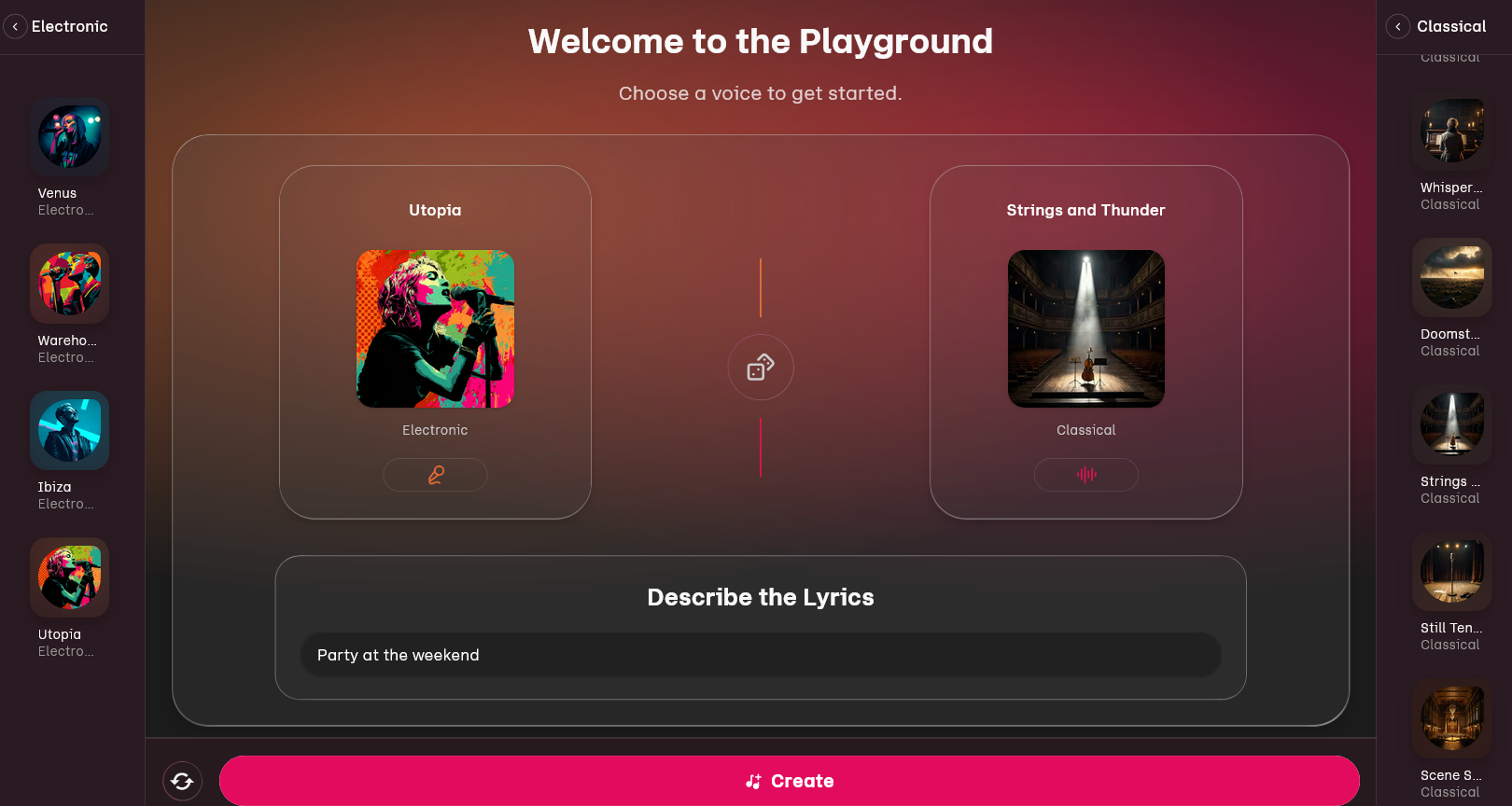 Udio enables the creation of complete songs with vocals, lyrics, and instrumentation based on text input, where themes, genres, and stylistic features are defined. Features include AI-assisted songwriting, selection of styles and voice types, and adjustments such as BPM and lyric timing.Additional options include audio inpainting for editing individual song sections, a remix function, and the creation of custom covers. Udio Playground provides a structured environment for iterative song development and comparison of different variants.Sessions integrates a DAW-like production environment that enables linear arranging, combining, and targeted customization of individual song sections within a song project.A partnership with Warner Music and Universal Music has been in place since the end of 2025.